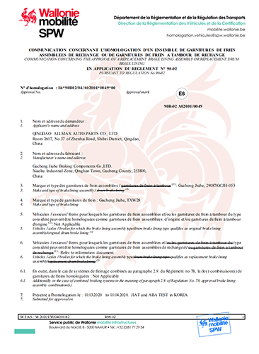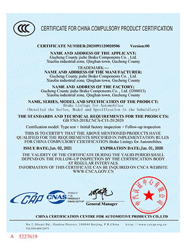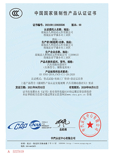 故城縣九和制動元件有限公司主導產品為:汽車剎車片、裝載機剎車片。剎車片采用高溫高壓的熱壓工藝、設備、生產線、能保證質量穩定,有為主機廠配套生產的經驗和能力。劉如根商標是公司主要商標,公司還有飛人標牌、蛟龍牌、橫空出世等品牌!公司有多個剎車片檢驗設備,剎車片摩擦性能定速摩擦試驗機與國家非金屬礦制品檢驗中心試驗機是同公司生產的同型號試驗機。拖曳試驗機2020年通過中國建材檢驗集團咸陽有限公司檢驗合格,剪切試驗機;布氏和洛氏試驗機。2021年公司通過國家強制性CCC認證、通過過19001-2000idt ISO 9001:2015質量體系認證,IATF16949認證,歐盟Emark認證。剎車片執行GB/T11834-2011、GB 5763-2018標準。公司產品先后曾給山東臨工、徐工、卡特彼勒(山工)、徐州美馳車橋公司、肥城金城橋公司,山東路通橋箱科技公司,山東博士樂公司,郯城郯液公司,日照金···